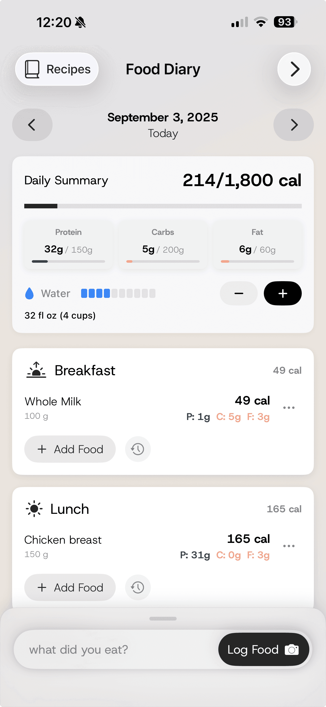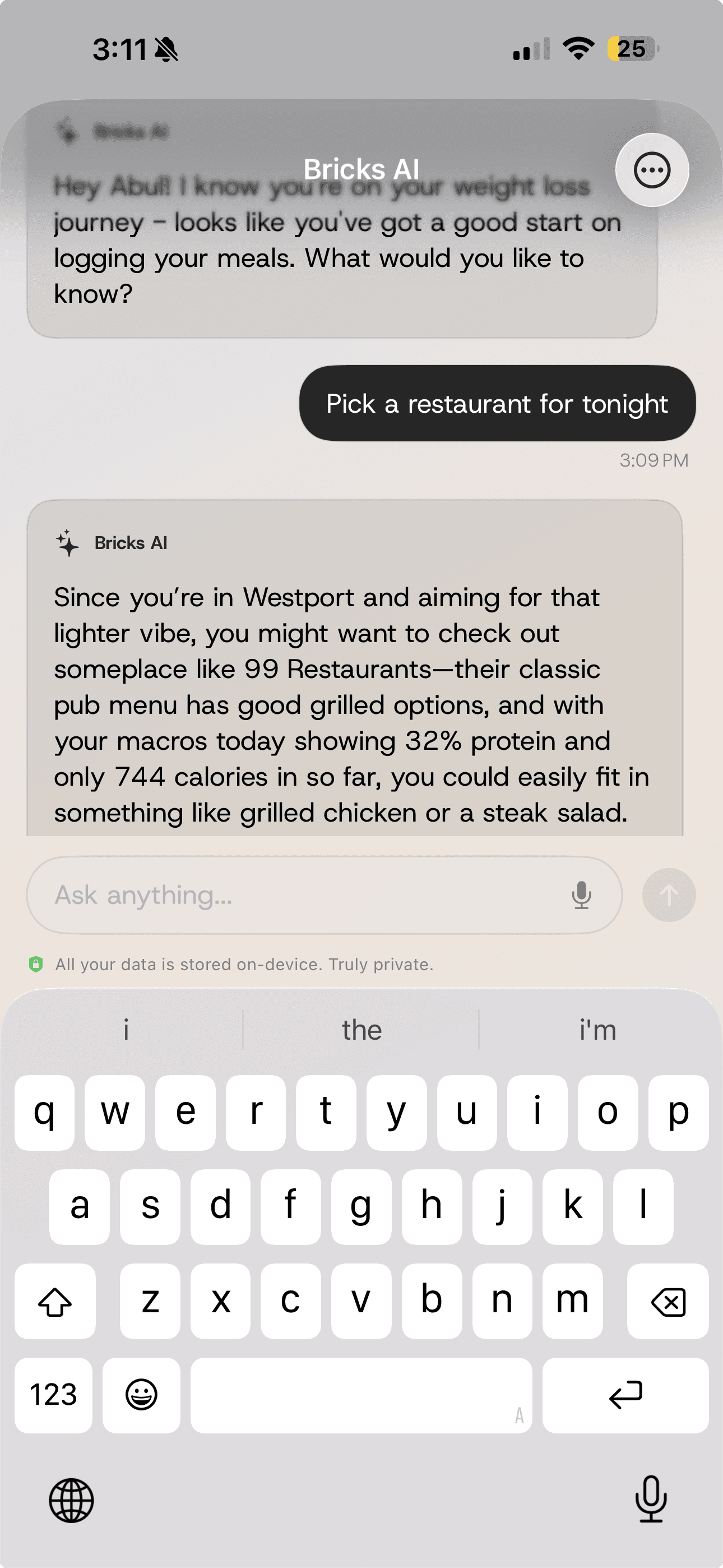 The AI chat is the best part. I can ask about my meals, workouts, or even restaurants, and Bricks responds with full context of my past logs.